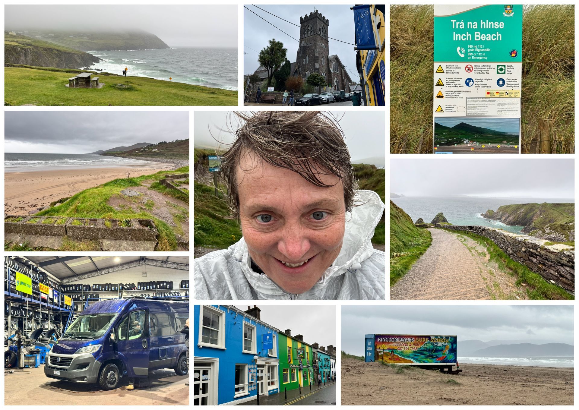 Ma è dopo questo stop che 3dom ha cominciato a fare i capricci. Batteria morta tutte le volte che mi fermavo e uso del booster per farlo ripartire. Tutto gestibile fino alle scogliere di Kerry (bellissime tra l'altro). Tirava un vento pazzesco (lo vedrete dalle foto se mai date un'occhiata). Il van è inizialmente ripartito ma con diverse spie accese e a 100 metri dal parcheggio le marce non entravano più. La batteria a zero ha un effetto su tutte le funzioni... Confesso un pelo di panico. Ma avevo poca scelta. Quindi 4 frecce (che non funzionavano ovviamente), rispento tutto, ricollegato il booster e lasciato per un pò di tempo. per fortuna tutto è ripartito. Ma a quel punto non ho voluto più spegnere il motore fino al rientro a Killarney. Non ho però rinunciato a fare alcune delle tappe lasciando il motore acceso, anche se non era possibile fare proprio tutto come avrei voluto. Rientrando ho chiamato un rivenditore di batterie a Killarney (una metropoli per gli standard locali - 15,000 abitanti) che mi ha detto che non poteva aiutarmi ma che se andavo dal ragazzo dietro la palestra di fianco al suo negozio, sicuramente mi trovava una soluzione. E poi ha aggiunto una cosa un pò bizzarra: ha dei bei modi. Ahahahah... Devo dire che Irlandesi antipatici finora non penso di averne incrociati. Alcuni non li capisco, ma è un mio problema. Quindi mi dirigo verso questo mitico Galvin. Galvin era andato a casa, quindi penso non sapremo mai se ha dei bei modi. Ma non lontano c'era un gommista e mi son fermata. E qua un signore irlandese veramente incomprensibile (poveretto gli ho fatto ripetere le cose 4 volte), ha risposto al mio 'I have a problem' dicendomi che se torno domani mattina alle 9 mi cambia la batteria! Hurrah! Speriamo bene!