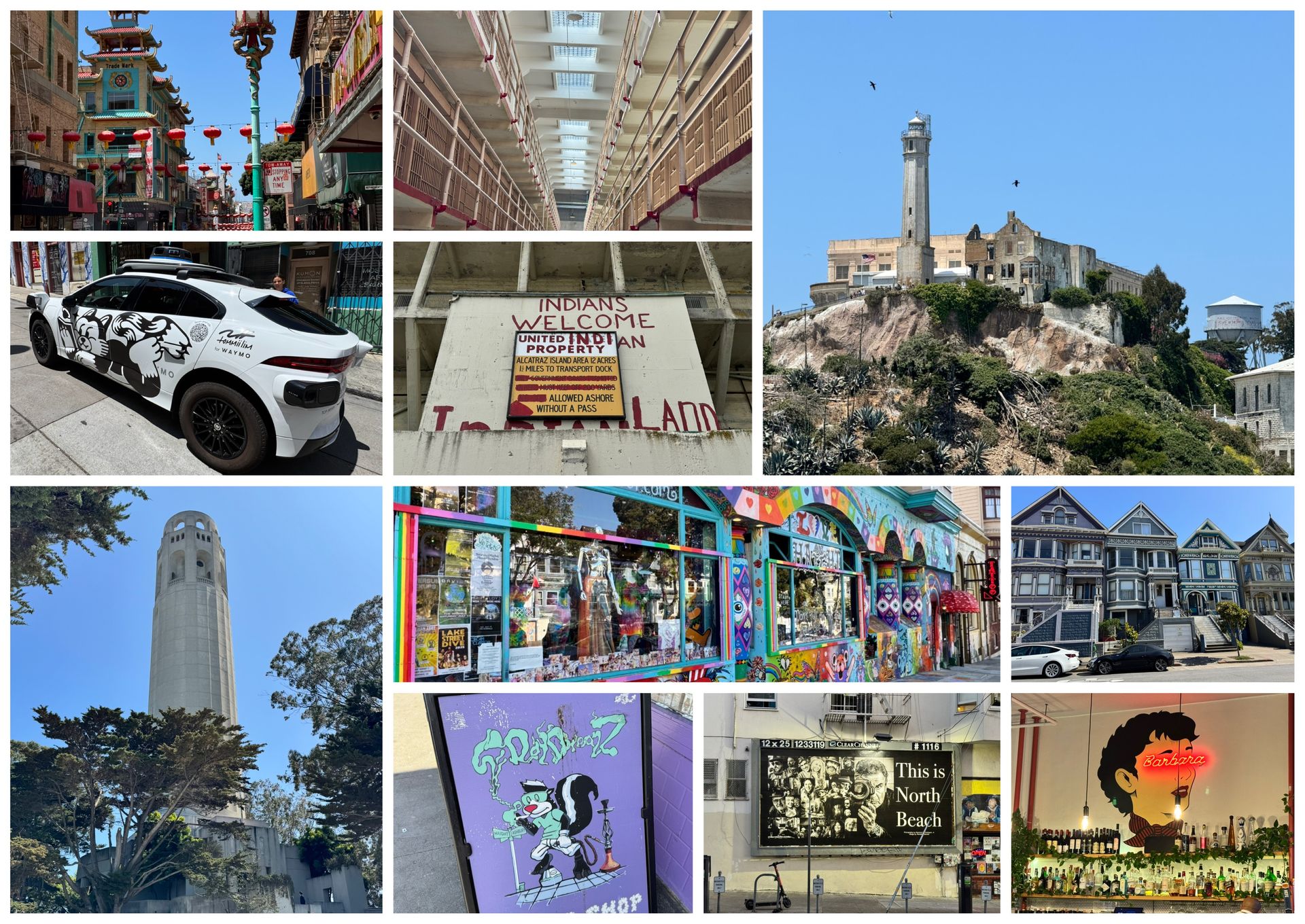 Siam rientrate con un traghettino (la cui rotta passava molto vicino as Alcatraz) e ne abbiamo approfittato per prendere un po di sole sul top deck. Una volta riportate le bici, siamo rimaste a girare tra Pier 39 e 41 dove, su K deck, i leoni marini rubano la scena. Si radunano lì perché (abbiamo chiesto a chatGPT), pesce come aringhe e acciughe attira le colonie affamate, in un luogo sicuro e lontano da predatori come squali e orche. La cosa buffa è che sono sicuramente animali sociali (dormono uno sull’altro praticamente), ma più grossi sono meno si muovono. I piccoli giocavano a buttarsi in acqua mentre quelli giganti dormivano con il muso rivolto verso il sole. Come spiaggiati su un divano…da ridere credetemi. Il nostro giro tra i negozietti non ha fruttato granché, se non una visita ad un negozio di CBD (abbastanza comuni qua in America) molto di design, dove, dopo aver declinato spiegazioni su funghetti allucinogeni e CBD per umani, ci han fatto vedere che avevano prodotti anche per animali da compagnia. Sia anti dolorifici che calmanti. È vero che per alcune malattie l’effetto anti dolorifico è veramente una cosa che dona una qualità di vita migliore a chi soffre. Ahimè non siamo state capaci di trovare un cappello conforme ai requisiti di G: bordeaux e con la scritta in caratteri particolari. Poco male…