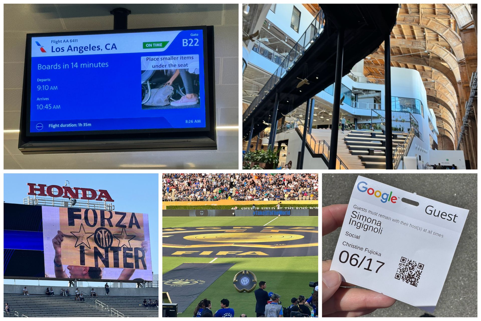 Inizialmente avremmo dovuto passare il pomeriggio in piscina prima della partita di esordio dell’Inter qui ai mondiali, ma la nostra visita agli uffici di Google a Playa Vista è stata anticipata a pranzo. Christine (ex collega di Niki) si è gentilmente offerta di farci fare un giro per questa sede un pò particolare (anche per gli standard di Google). Il blocco principale è stato riconfigurato nel 2017, cercando di ritenere l’essenza delle sue origini. Tra l’altro, diverse scene di film sono state girate all’interno di questo spazio. Originariamente costruito da Howard Hughes nel 1943 per la costruzione dell’aereo Hercules IV (alias “Spruce Goose”), l’hangar ora comprende spazi di lavoro, spazi per riunioni ed eventi e spazi per i servizi dei dipendenti. È un posto pazzesco e come dice G, ti fa venir voglia di andare in ufficio. Bellissimo. Christine è responsabile globale per YouTube per musica/podcasts etc e lavora per Google da 15 anni. Alla domanda: cambieresti mai? La risposta è stata: è veramente difficile lasciare Google…no. Ha anche detto che i tagli di personale degli ultimi anni sono stati duri da digerire, anche per la mole di lavoro che conseguentemente è cresciuta. Ha confermato che Google preferisce avere i dipendenti in ufficio che non a casa e richiede ALMENO tre giorni alla settimana in presenza. E, quel 20% di tempo da dedicare a progetti diversi dal proprio ruolo (per dare tempo alla creatività di inventare) di cui Niki mi aveva parlato, non fa più parte del mantra aziendale. Diciamo che sotto questi aspetti l’azienda si è normalizzata. No anche al part time di cui godevano alcuni dipendenti in passato (Niki lavorava 4 giorni la settimana). Ma, il cibo gratuito c’è, la sala giochi anche, la palestra con personal trainer a disposizione, coffe corners ovunque etc. Hanno ache una zona che sembra un giardino per permettere chi vorrebbe lavorare all’aperto di avere un ambiente simile (Playa Vista non ha spazi esterni per i dipendenti). Ma la taglio corta: posto veramente pazzesco! Ma non ci hanno assunte e abbiamo salutato Christine per dirigerci in albergo e prepararci per il nostro evento serale: la partita!
