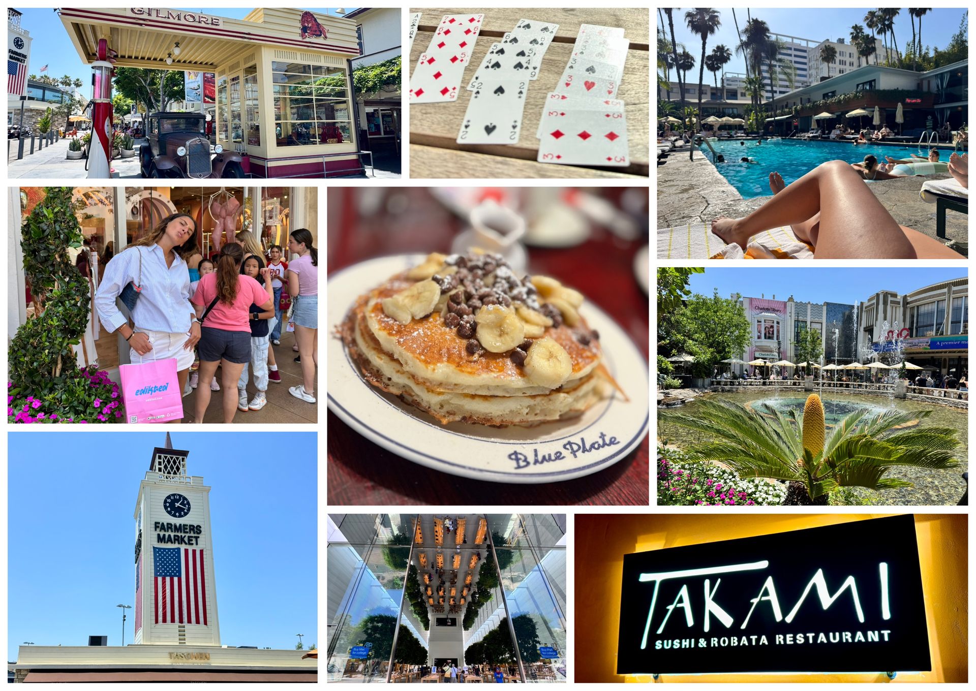 Giornata da definire libera. Dettata, se proprio vogliamo dargli degli obbiettivi, dallo smarcare la lista dei negozi da visitare. Ma, prima di tutto, colazione! Pur avendo mangiato di tutto, non avevamo ancora provato i pancakes. Un’attenta ricerca su internet (anzi chatGPT) ci ha portato da Du-par’s. Fanno pancakes dal 1938 e non cambiano il decor dagli anni 50. Proprio un classico diner americano. Con il plus di essere nel Farmer’s Market (stile Spitafield Market ma solo di cibo) e quindi a due passi da ‘the Grove’: obbiettivo shopping centrato. I pancakes? Prima ci si doveva sedere! Qua un po della milanesità di G è uscita nello spazientirsi sulla gestione dei tavoli. Ma la coda si è smaltita in 10 minuti. E dentro, era proprio un diner (affollato), con i camerieri che sfilavano alla velocità della luce a consegnare pile di enormi pancakes (e altro ovviamente, ma i pancakes erano impressionanti). La scelta: short stack o full stack? Onestamente un pancake sarebbe bastato…quindi noi abbiamo optato per lo short stack (3 pancakes), e ne abbiamo lasciato la metà. E devo dire che erano soffici e proprio buone. 25 minuti di attesa basterebbero per un risotto, ma, non facciamo i pignoli.
