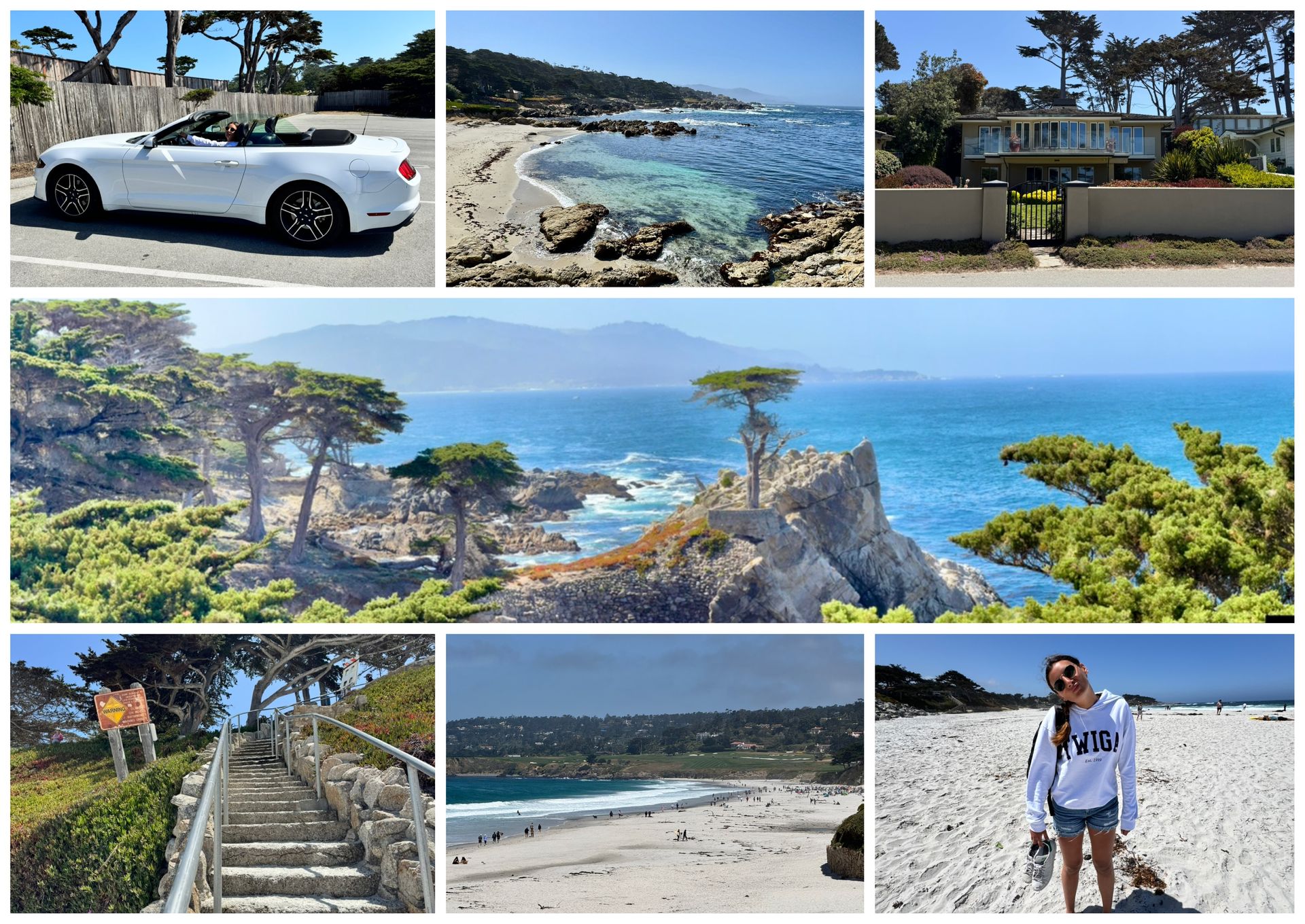 L’ultima tappa del nostro viaggio è stata Carmel by the sea. Ma prima di tutto abbiamo fatto una capatina da Starbucks, ai confini di Carmel. Ed è li che ho fatto ridere G, facendomi una chiacchiera con una sciura del luogo che avendo sentito una lingua straniera, ha chiesto se eravamo di passaggio e mi ha dato dei consigli su cosa fare. Ma non mi mollava più…ed è qui che G ci ha raggiunte incuriosita dalla mia nuova amica. Carmel è una cittadina sul mare elegante, famosa per le sue casette fiabesche, le gallerie d’arte e l’atmosfera tranquilla. Abbiamo attraversato Ocean Avenue fino all’oceano e abbiamo svoltato a sinistra lungo la ‘scenic drive’. Qua comincia la spiaggia di Carmel e le ville vista oceano più eleganti della zona (o così aveva indicato la mia nuova amica). Anche qua i prezzi sono importanti e le più costose si aggirano tra i 15 e 30m USD, anche se, recentemente, una villa è stata venduta per 44m USD. Ma chi ha comprato casa qua? Brad Pitt e Clint Eastwood per esempio. E Clint ne è anche stato sindaco. Ed è su questa spiaggia Californiana che, per la prima volta in questo viaggio, ci siamo tolte le scarpe e abbiamo bagnato i piedi nell’oceano (gelato naturalmente). La sabbia era bianca e soffice come borotalco. E che contrasto con l’azzurro profondo dell’oceano. Veramente bello. Il bagno io non l’avrei mai fatto ovviamente, ma G lo farebbe in qualsiasi condizione. Ma invece di fare il bagno, ha chiamato i nonni, la mamma e la sorella per condividere il momento.