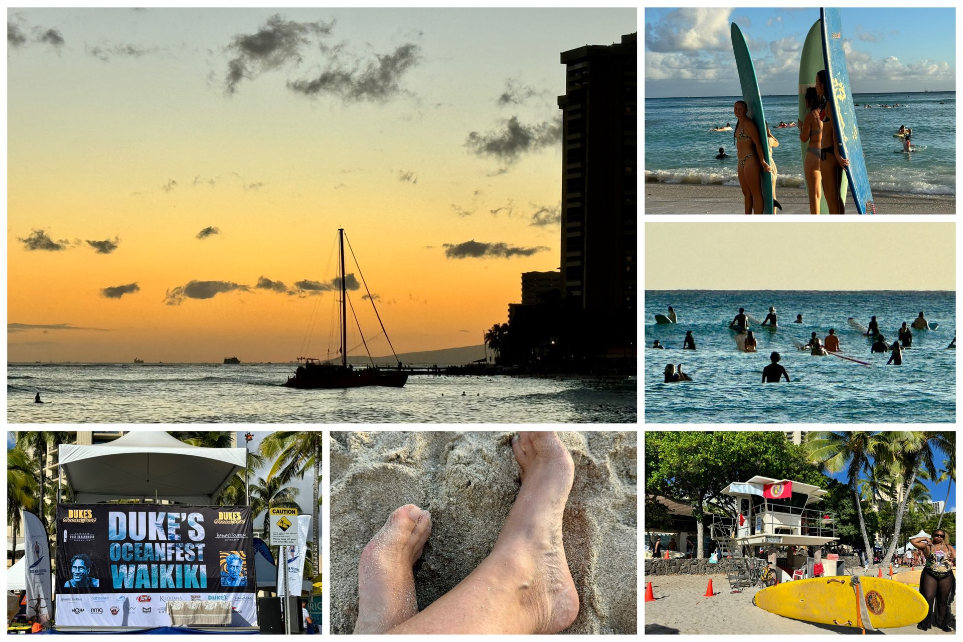 We had a celebratory swim and I finally went back to tackling my Settimana Enigmistica. Today was also Lucia’s last day with us as she is going back a little earlier than us, so we let her decide where we would spend the evening. We ended up watching the sun go down on the beach (we had not done that yet) with thousands of other people, in and out of the water. There we still surfers out there. And guess what…two weeks after we had visiter Duke’s in Malibu, we went to Duke’s barefoot bar for drinks and food as we were: swimsuit and ciabatte. There was live music and the usual unhealthy food on the menu of course. But what I nice evening. The beach was truly alive.