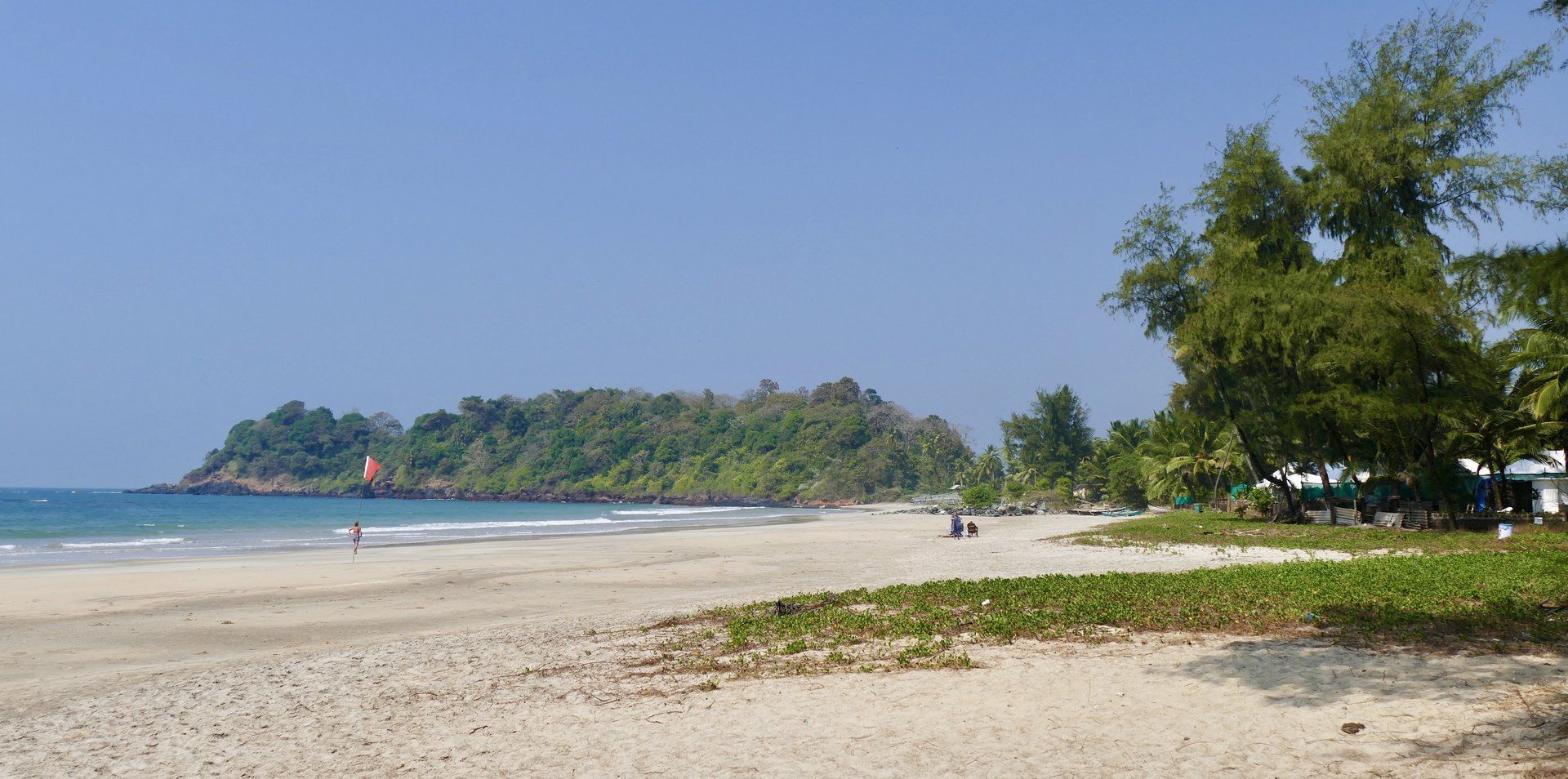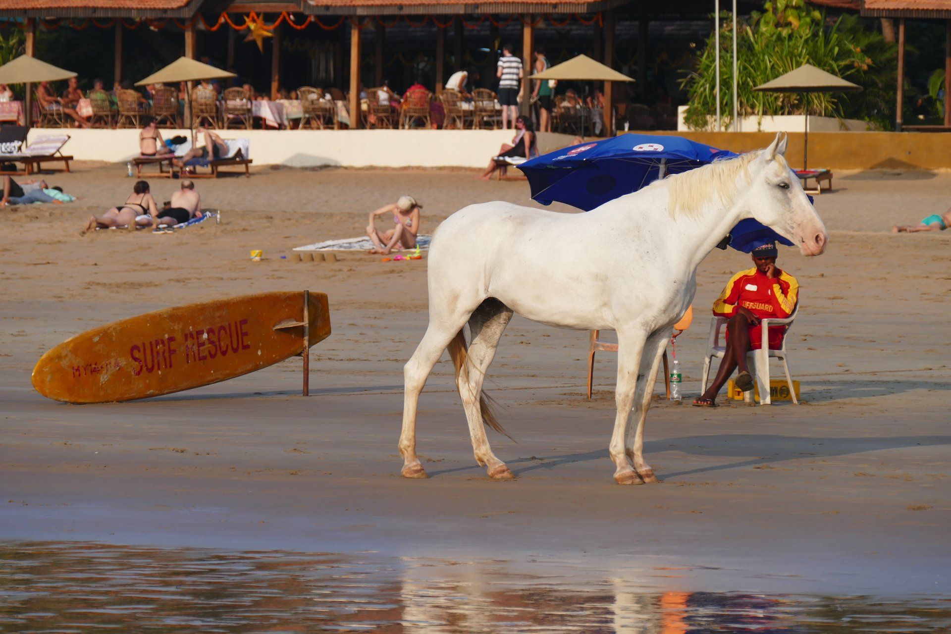 This beach however, has some interesting residents: a wild white horse and one of the many holy cows that roam the streets and indian countryside. There were way more dogs than at the previous place and they tended to be a little rough with each other, but no bother to any humans. The Indian baywatchers seemed to be busier strolling than baywatching, but there was little to worry about sea wise.
