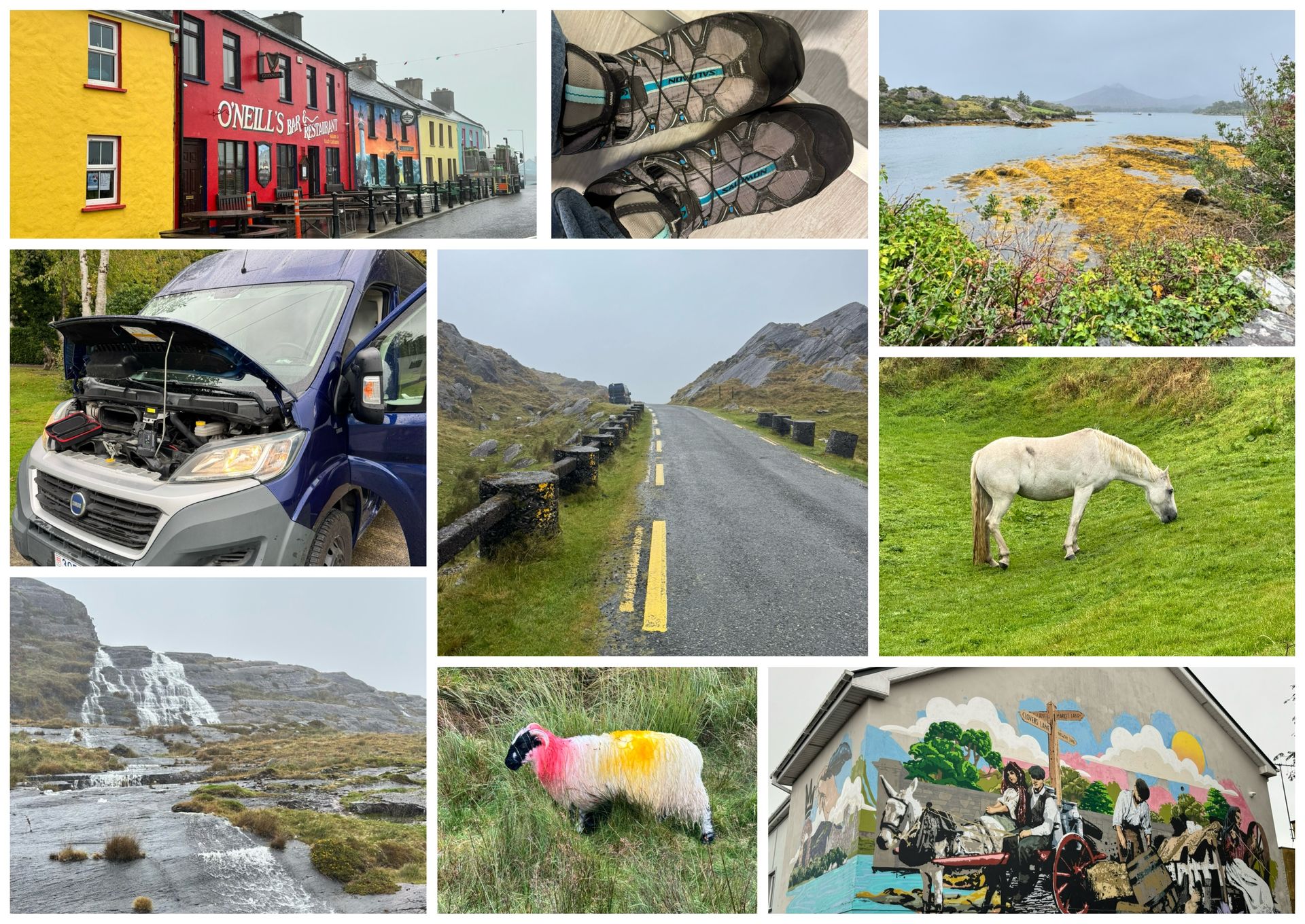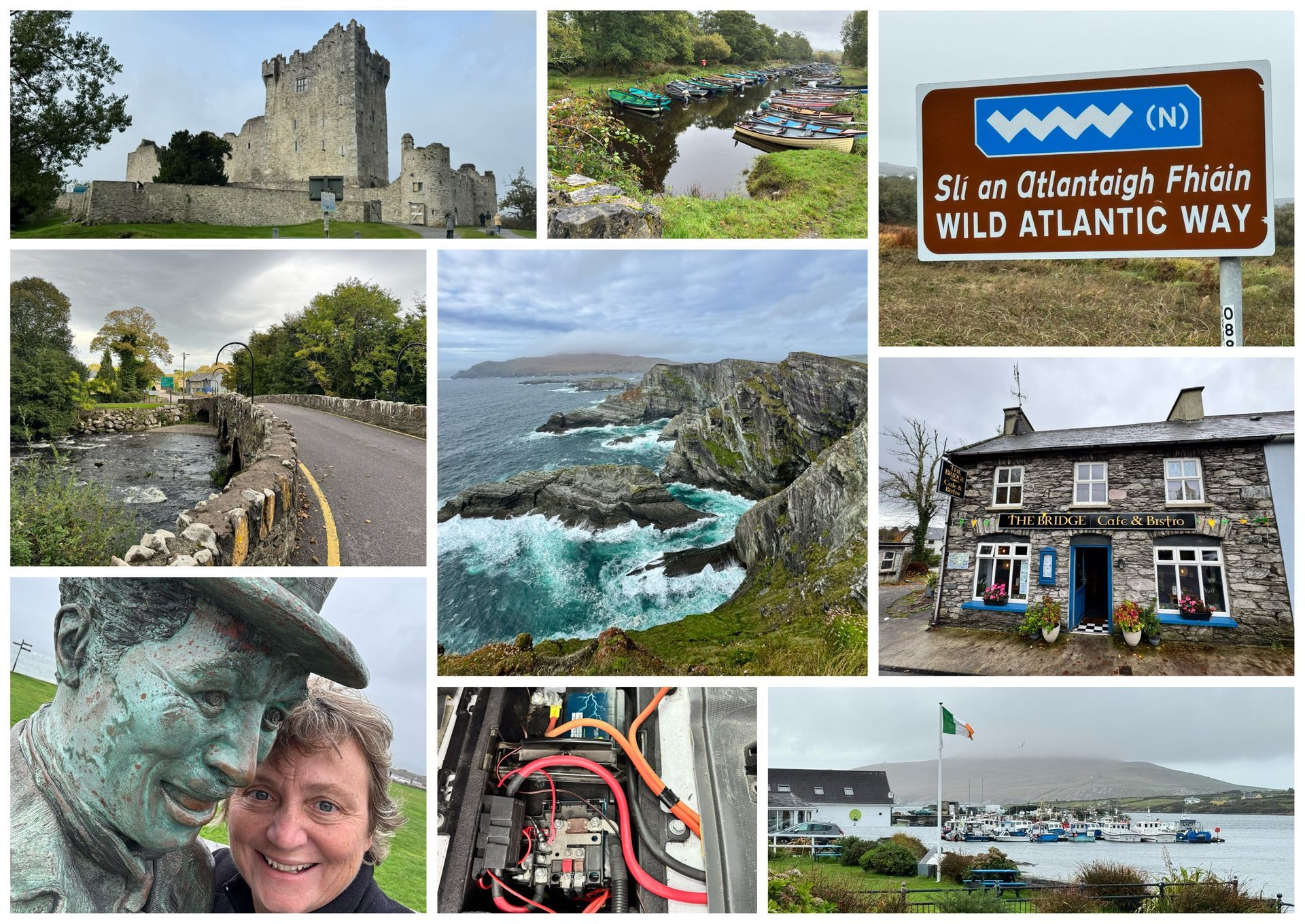 Ma è dopo questo stop che 3dom ha cominciato a fare i capricci. Batteria morta tutte le volte che mi fermavo e uso del booster per farlo ripartire. Tutto gestibile fino alle scogliere di Kerry (bellissime tra l'altro). Tirava un vento pazzesco (lo vedrete dalle foto se mai date un'occhiata). Il van è inizialmente ripartito ma con diverse spie accese e a 100 metri dal parcheggio le marce non entravano più. La batteria a zero ha un effetto su tutte le funzioni... Confesso un pelo di panico. Ma avevo poca scelta. Quindi 4 frecce (che non funzionavano ovviamente), rispento tutto, ricollegato il booster e lasciato per un pò di tempo. per fortuna tutto è ripartito. Ma a quel punto non ho voluto più spegnere il motore fino al rientro a Killarney. Non ho però rinunciato a fare alcune delle tappe lasciando il motore acceso, anche se non era possibile fare proprio tutto come avrei voluto. Rientrando ho chiamato un rivenditore di batterie a Killarney (una metropoli per gli standard locali - 15,000 abitanti) che mi ha detto che non poteva aiutarmi ma che se andavo dal ragazzo dietro la palestra di fianco al suo negozio, sicuramente mi trovava una soluzione. E poi ha aggiunto una cosa un pò bizzarra: ha dei bei modi. Ahahahah... Devo dire che Irlandesi antipatici finora non penso di averne incrociati. Alcuni non li capisco, ma è un mio problema. Quindi mi dirigo verso questo mitico Galvin. Galvin era andato a casa, quindi penso non sapremo mai se ha dei bei modi. Ma non lontano c'era un gommista e mi son fermata. E qua un signore irlandese veramente incomprensibile (poveretto gli ho fatto ripetere le cose 4 volte), ha risposto al mio 'I have a problem' dicendomi che se torno domani mattina alle 9 mi cambia la batteria! Hurrah! Speriamo bene!