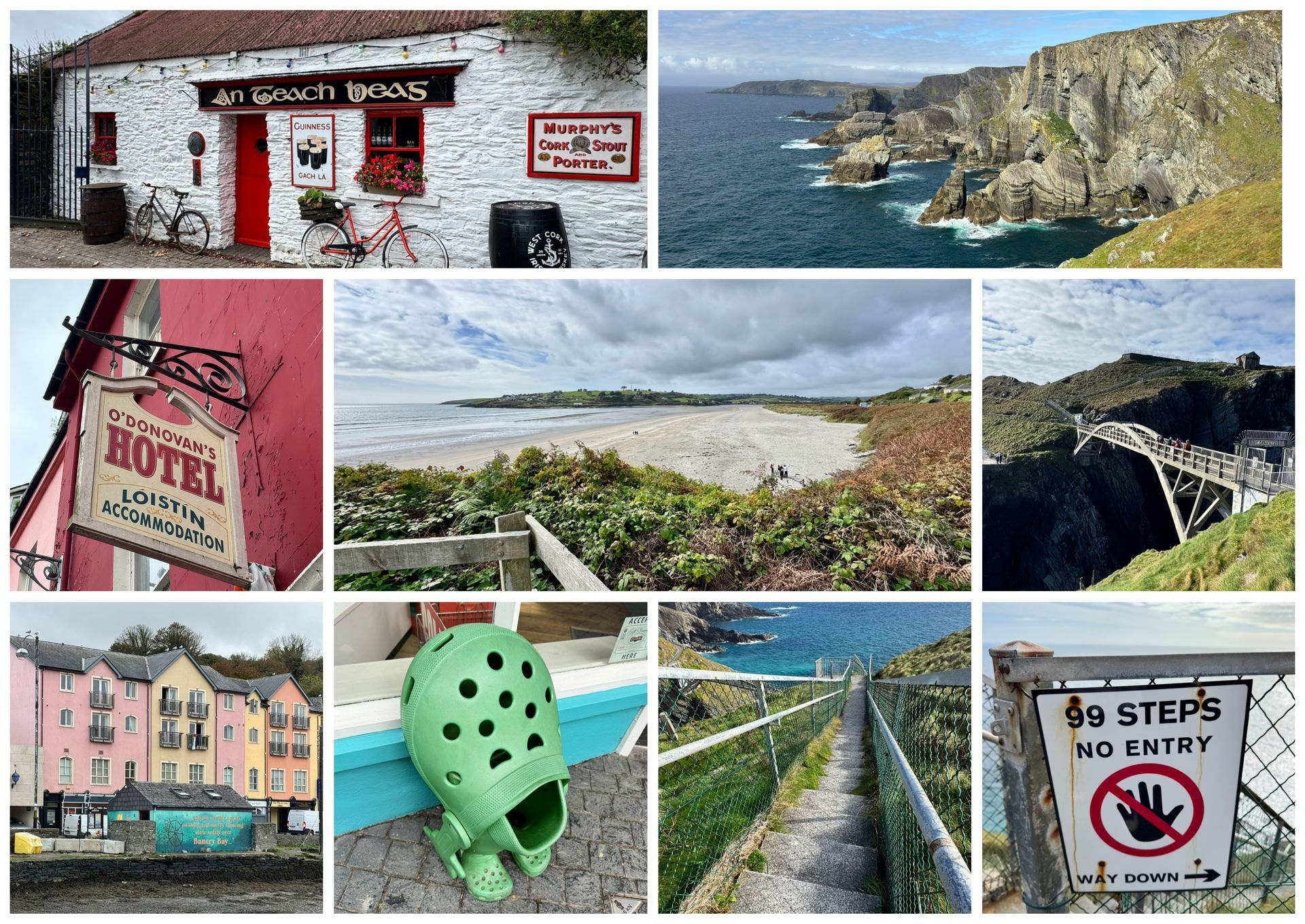 E che dire di Inchydoney Beach? Un angolo suggestivo...e un ottimo stop per pranzo a soli 10 minuti dal villaggio. A seguire, dopo una breve pausa 'call', ho raggiunto Mizen Head: è il punto più a sud-ovest dell’Irlanda, famoso per i suoi paesaggi spettacolari lungo la Wild Atlantic Way. Il ponte pedonale panoramico che collega le scogliere al faro con viste mozzafiato sull’oceano, è stato il mio vero challenge della giornata, insieme alla scalinata che terminava con una specie di terrazzino sul vuoto. Non capirò mai questa paura di cadere nel vuoto che mi assale mio malgrado... Non ho avuto la spensieratezza di alcuni altri turisti che si sono soffermati in mezzo al ponte per guardare l'abisso, ma per la mia media, sono stata coraggiosa. E ne è valsa proprio la pena e la fatica delle scalinate.